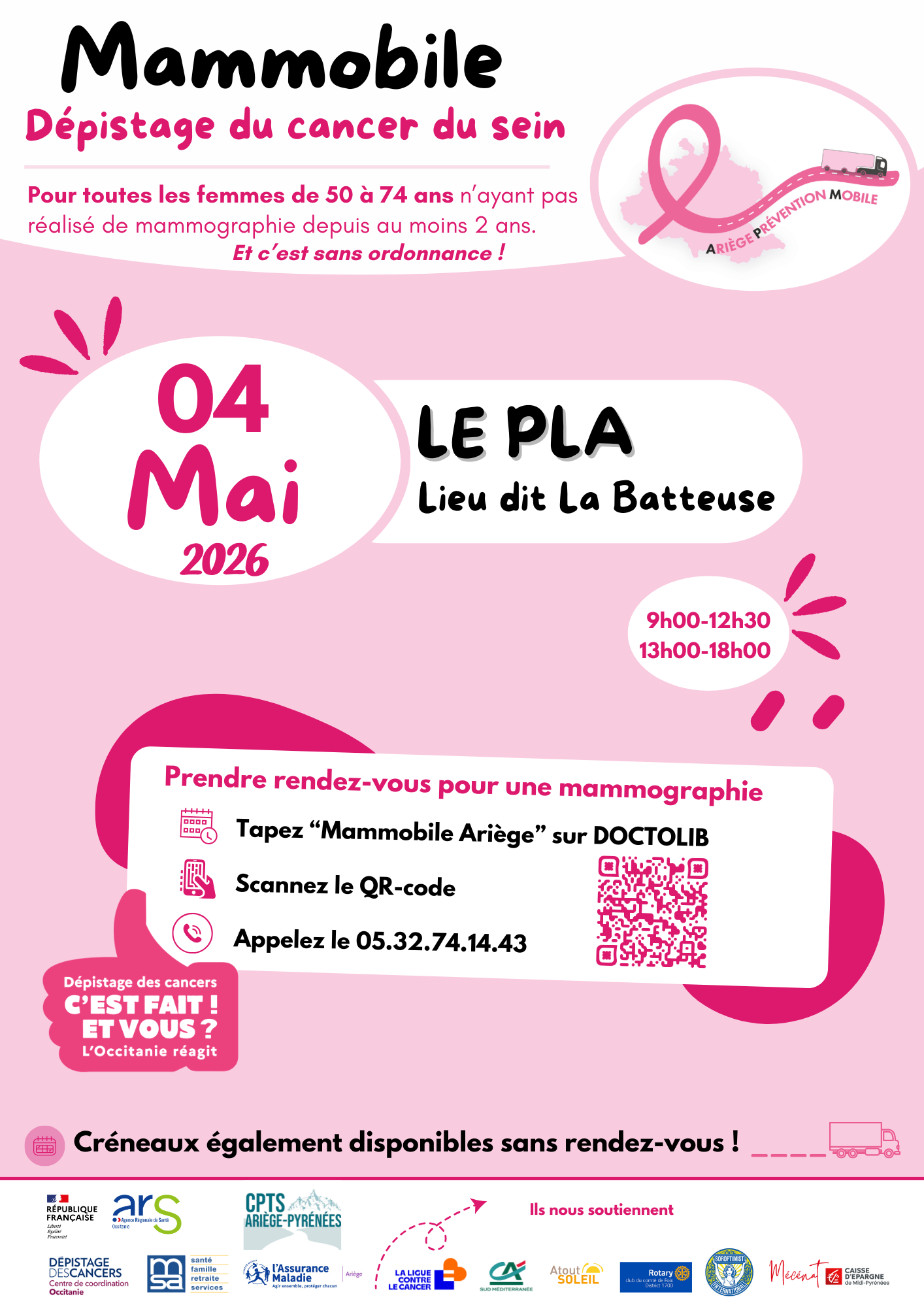 Nous avons le plaisir de vous confirmer que le Mammobile sera présent à LE PLA le 4 mai 2026 pour la réalisation de mammographies.