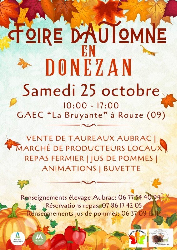 La foire d'automne en Donezan se déroulera le Samedi 25 Octobre 2025 de 10 h à 17 h au GAEC La Bruyante ( Barrage de Rouze)..